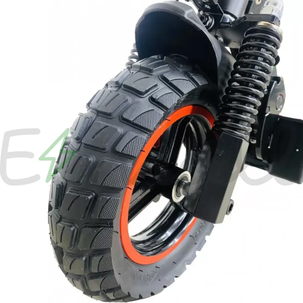 Электросамокат Kugoo Max Speed имеет задний привод, двигатель мощностью 600 Вт, напряжение 48 вольт, развивает максимальную скорость 45 км/ч, есть возможность подобрать скоростной режим, 3 скорости. Достаточно резвый и маневренный. Устройство питается от аккумуляторной батареи 11 А*ч, он скрыт в деке. При такой емкости запас хода на одном заряде доходит 25-35 км пути. Для передвижения по гравийным и грунтовым дорогам электросамокат оснащен парой пружинных амортизаторов на переднем и парой на заднем колесе, в сочетание с амортизированным сидением передвижение на агрегате плавное и комфортное. Колеса 10 дюймов в диаметре. Дисковая тормозная система на двух колесах.