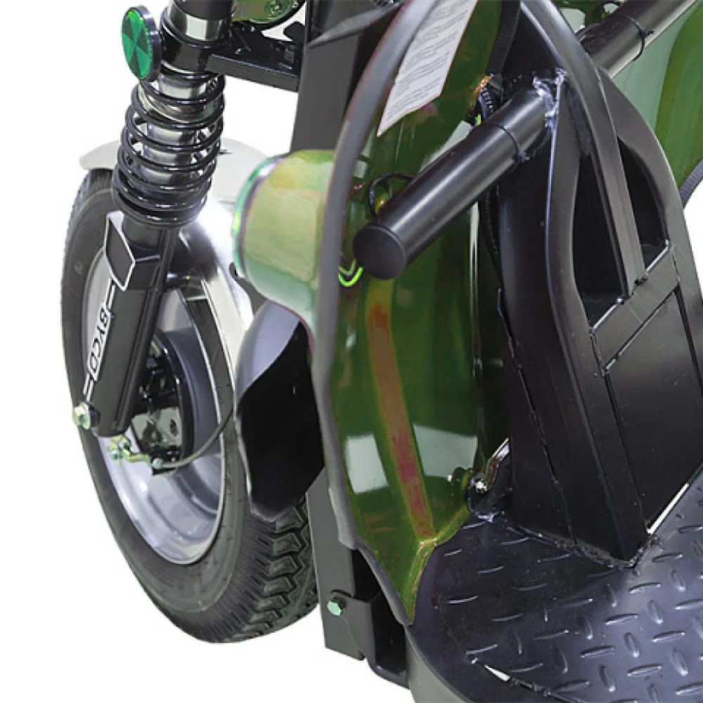 Всесезонная техника оснащена зеркалом заднего вида, мощной светодиодной фарой, удобным комфортным сиденьем. С такими характеристиками управлять электротрициклом удобно.