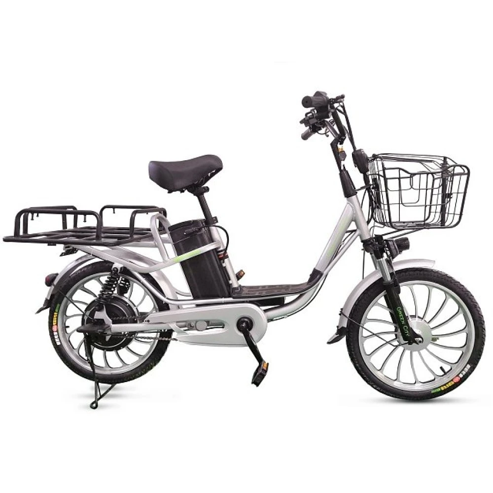 Велогибрид Green City BETA – абсолютно новая модель для Eltreco. Модель обладает классической конструкцией утилитарного и максимально практичного электровелосипеда. Стальная рама со съёмным аккумулятором имеет малые габариты, которые, в совокупности с 20-дюймовыми колёсами, дают велосипеду максимальную манёвренность. Как и на обычный городской велосипед, на Green City BETA установлена 1-скоростная трансмиссия и практичные барабанные тормоза, что делает велосипед комфортным для передвижения по городу. Кроме того, для удобного преодоления всяческих неровностей велогибрид оснащён амортизационной вилкой и рессорами. Велосипед имеет 2 багажника – спереди небольшая корзинка для сумки или рюкзака, а сзади – широкий грузовой багажник, который подойдёт для доставки различных вещей.