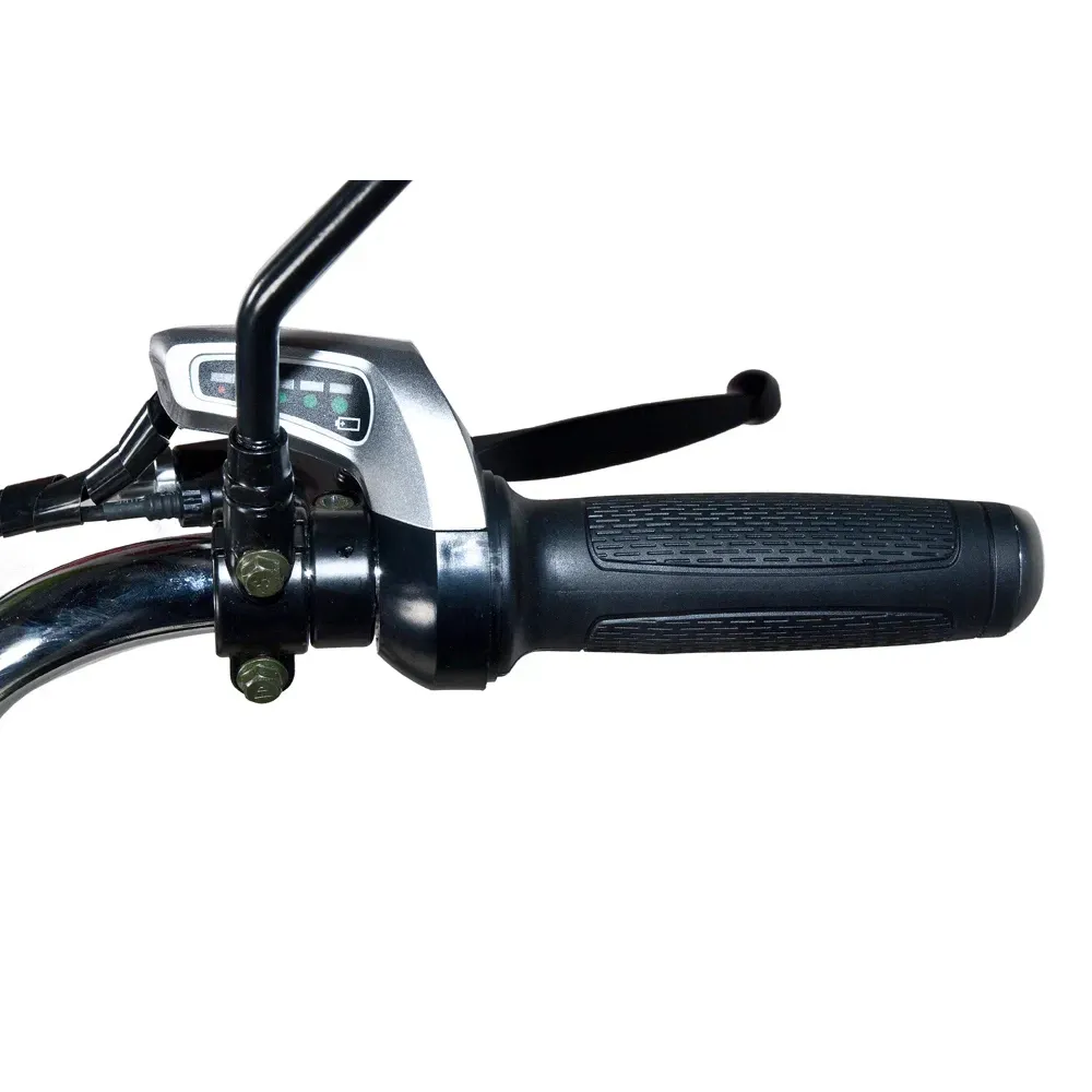 Рама электровелосипеда низкая, изготовлена из прочного алюминия. АКБ размещено в боковое части, от сидения, не мешает при движении. Наличие передней корзины и удобное подножки увеличивает сферу применения электровелосипеда. Техника удобна не только для активного время провождения, но и поездок в магазин. Проблем с парковкой не возникает. Для покупки тс сейчас предлагаем связаться с нами в онлайн-чате или позвонить по телефону.