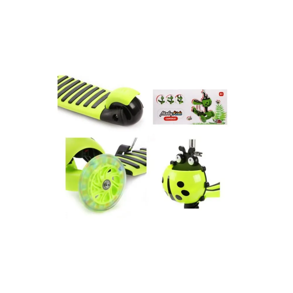 Детский самокат-трансформер Moby Kids 3 в 1 по достоинству оценят дети и их родители. Яркий привлекательный дизайн придётся по душе даже самым юным пользователям. Божья коровка на рулевой стойке выполняет не только декоративную функцию, но и служит для хранения мелких вещей. Данная модель представляет собой многофункциональный транспорт, которым могут пользоваться малыши возрастом от одного года. Управляет самокатом в данном случае взрослый при помощи специальной ручки, а ребенок может комфортно откинуться на мягкую спинку, держась за удобные ручки с ограничителем. Убрав ручку, вы получите беговел, на котором ребёнок передвигается сидя, попеременно отталкиваясь обеими ногами. После снятия сидения беговел превращается в настоящий самокат и ваш малыш может смело осваивать новый вид транспорта! Платформа с нескользящим покрытием обеспечивает устойчивое положение ног, позволяя ребёнку чувствовать себя безопасно и полностью сконцентрироваться на управлении. Два передних колёса оснащены светодиодами, которые излучают разноцветное сияние во время движения, радуя юного водителя при каждой поездке. Благодаря регулировке руля самокат «растет» вместе с ребёнком, что позволяет использовать одно транспортное средство в течение нескольких лет.